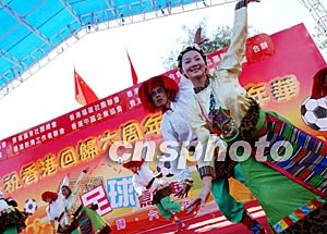 為慶祝香港回歸祖國六周年,香港十個團體合作籌辦的“慶祝回歸祖國六周年足球嘉年華”一連三天在維園舉行。圖為7月1日典禮儀式上龍獅起舞,歡慶佳節(jié)。洪少葵 攝