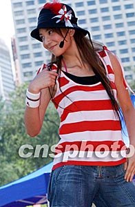 香港歌手鄭希怡,7月1日在維園舉辦慶祝香港回歸祖國活動中,載歌載舞表演助興。洪少葵 攝