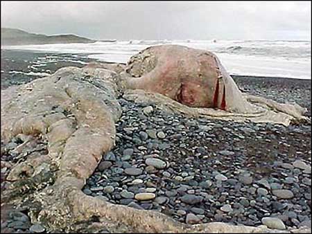 上周被海水沖上智利蒙特港附近海灘的一大塊黏滑肉質(zhì)物體可能是一種稀有的巨型章魚(yú),或者只是死去鯨魚(yú)的一塊鯨脂。智利鯨魚(yú)保護(hù)中心表示,這具遺骸長(zhǎng)12.4米,重約13噸,6月24日在馬烏林附近的太平洋海岸被人發(fā)現(xiàn),原先人們誤認(rèn)為是鯨魚(yú)。