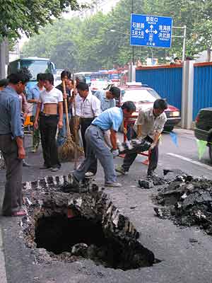 中新網(wǎng)7月4日電 據(jù)南京現(xiàn)代快報報道,昨日下午,南京新街口附近兩處路面發(fā)生塌陷。塌陷雖與地鐵建設(shè)沒有直接的關(guān)系,但給南京地鐵建設(shè)部門敲響了警鐘,負(fù)責(zé)地鐵建設(shè)的有關(guān)人士稱,在前期預(yù)防的基礎(chǔ)上,針對近期的梅雨,他們制定了防范措施。