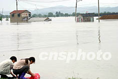 七月四日,安徽淮河分洪仍在繼續(xù),不少淮河岸邊低洼地區(qū)的房屋被水淹,一位房屋的主人不忍再看被淹的房屋。中新社記者 盛佳鵬 攝