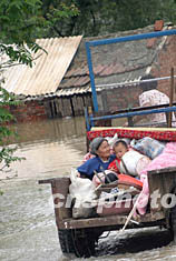 七月四日,安徽阜陽縣一戶農(nóng)民全家乘坐拖拉機轉移到高地。由于安徽淮河分洪,部分低洼地區(qū)的房屋被淹。中新社記者 盛佳鵬 攝