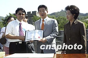 盧武鉉與夫人登上北京八達(dá)嶺長城,并獲得登城證書。中新社記者:毛建軍  盧武鉉與夫人登上北京八達(dá)嶺長城,觀看獲贈(zèng)的城磚復(fù)制品。中新社記者:毛建軍