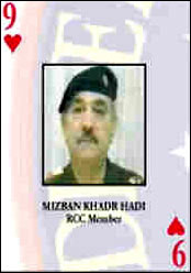 美軍中央司令部當(dāng)天發(fā)表聲明說,伊拉克阿拉伯復(fù)興社會(huì)黨的一名地區(qū)領(lǐng)導(dǎo)人、伊革命指揮委員會(huì)成員哈迪8日向駐巴格達(dá)的美軍投降。他在被美軍通緝的55名前伊拉克高官名單中排名第23位,在美軍撲克牌通緝令中為紅桃9。