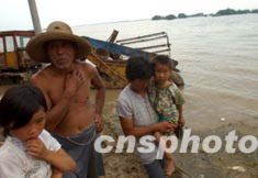 七月中旬的淮河洪水迫使安徽省穎上縣多處行洪區(qū)緊急破堤行洪,許多百姓被困在滔滔洪水中的高臺(tái)地帶,救濟(jì)成為當(dāng)務(wù)之急。圖為洪水圍困邱家湖行洪區(qū)堤上的農(nóng)民。中新社記者:賈國(guó)榮