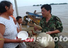 安徽省穎上縣半崗鎮(zhèn)空臺(tái)村的一千多名男女老少,因邱家湖七月十二日破堤行洪而被洪水四面圍困,災(zāi)民們吃的是用發(fā)霉的麥子做的面餅,不少人吃后都肚子痛。圖為災(zāi)民讓乘船前來看望的解放軍軍分區(qū)指揮員嘗一口這種面餅。中新社記者:賈國(guó)榮