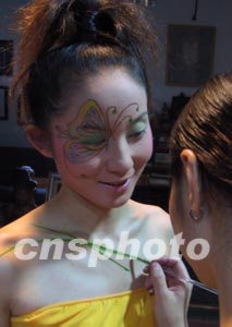 一名愛美的福州女子十八日欣然接受職業(yè)化妝師的彩繪裝扮。人體彩繪在福州成為一種時(shí)尚。作者:劉可耕