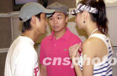 歌星黃伊汶、梁奕倫、范振鋒(右起)7月18日出席香港電臺(tái)節(jié)目《娛樂(lè)滿天星》訪問(wèn),三人同屬環(huán)球唱片公司,節(jié)目未開(kāi)始時(shí)聚首交頭接耳了解事情最新動(dòng)態(tài)。中新社記者:鄧慶樂(lè)