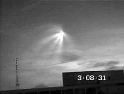 不過(guò),不管怎么說(shuō),俄軍方要求天文愛好者把拍到的錄像給他們看看,結(jié)果斷定確實(shí)是二級(jí)火箭分離時(shí)的情景。至此,在全世界都鬧得沸沸揚(yáng)揚(yáng)的鄂木斯克城UFO之謎真像大白。圖為當(dāng)時(shí)拍的奇異情景(徐冰川/聞新芳)