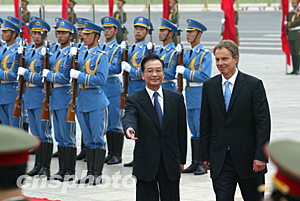 中國國務(wù)院總理溫家寶二十一日在北京舉行儀式,歡迎英國首相布萊爾訪華。中新社記者:滿會(huì)喬