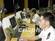 今年第八號強熱帶風(fēng)暴“天鵝”預(yù)計二十一日傍晚在海南到湛江一線沿海登陸,湛江海事局交管中心工作人員利用先進的船舶交管系統(tǒng)(VTS)指揮船舶做好防風(fēng)準備。作者:潘文