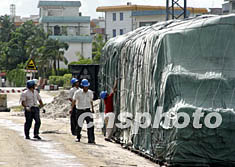 今年第八號強熱帶風(fēng)暴“天鵝”預(yù)計二十一日傍晚在海南到湛江一線沿海登陸,廣東湛江港工人正在加固貨堆,做好防風(fēng)準備。作者:李小軍