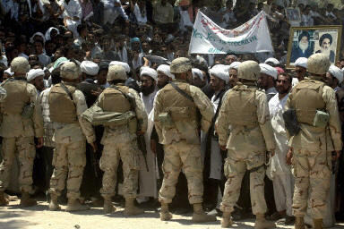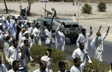 示威者在納杰夫市內(nèi)一主要清真寺門前集合,步行到由美國海軍陸戰(zhàn)隊(duì)把守的市政廳門前,并高呼“不要美國”等口號。有些憤怒的伊拉克人還向美國士兵投擲石塊,美軍沒有開槍還擊。