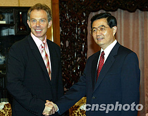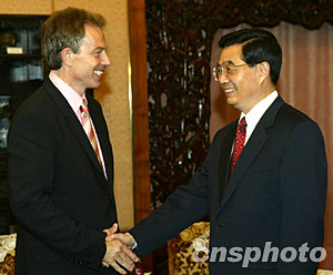 中國國家主席胡錦濤二十一日在北京會見英國首相布萊爾。中新社記者:滿會喬