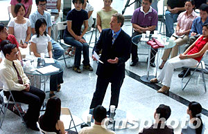 英國(guó)首相布萊爾七月二十二日在北京清華大學(xué)傾聽一位研究生的提問(wèn)。中新社記者:賈國(guó)榮