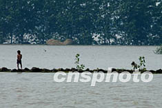 中國安徽省今夏發(fā)生近五十年最嚴(yán)重的淮河洪水,前兩次洪峰因及時(shí)分洪而去,但第三次洪峰正在形成。圖為穎上縣的洪水與行洪區(qū)連成一片,土堤上的孩子和小狗處境堪憂。中新社記者:賈國榮