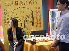 香港家庭用品、禮品及贈品綜合展,七月二十三日在香港會展中心開幕,圖為展會上一廣告商以看相指點(diǎn)迷津吸引參觀者。中新社記者:錢興強(qiáng)