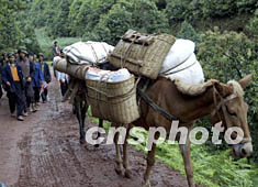 大批來自政府和社會各界的救災物資二十三日抵達云南省大姚縣地震災區(qū),馬幫為地處大山深處的震中災區(qū)運送生活必需品等救災物資。中新社記者:毛建軍