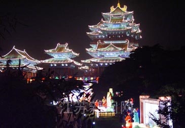 與彩燈相輝映,閱江樓也全樓亮燈,在夜幕的襯托下,光彩照人,場面十分壯觀。