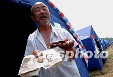溫家寶總理七月十二日在安徽省阜南縣王家壩看望的七十二歲災民鄭治學,原來是抗美援朝老戰(zhàn)士,他至今在救災帳篷里保存著當年志愿軍彭徳懷司令員和朝鮮金日成將軍的圖片等紀念品。中新社記者:賈國榮