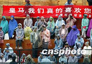 各地球迷二十七日在昆明冒雨觀看皇家馬德里足球隊巨星們的訓(xùn)練,激情依然不減。中新社記者:毛建軍