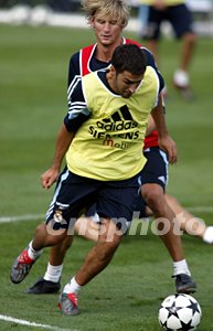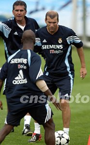 皇家馬德里足球隊技戰(zhàn)術(shù)訓(xùn)練,主帥奎羅茲在齊達內(nèi)身后督戰(zhàn)。中新社記者:毛建軍