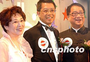 全球第一條二十四小時(shí)中文娛樂(lè)新聞?lì)l道香港《有線娛樂(lè)新聞臺(tái)》日前正式啟播,圖為藝員李司棋(左)、香港電視有線公司主席吳天海(中)和徐小明在啟播儀式上。中新社記者:錢興強(qiáng)