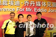 二十九日,喬丹車隊(duì)總裁埃迪·喬丹在上海出席媒體見面會,表示喬丹車隊(duì)有信心獲得F1上海站的冠軍。圖為埃迪·喬丹在見面會上與中國車手江騰一(左二)等合影留念。作者:湯彥俊