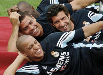 夏日的昆明,訓(xùn)練間隙,皇家馬德里隊的三大巨星羅納爾多、齊達內(nèi)和卡洛斯愜意的躺在訓(xùn)練場上,享受著“春城假日”。