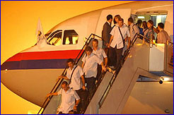 據(jù)悉,雖然皇馬一行要凌晨0時(shí)35分才能飛抵北京,但在昨晚10時(shí)15分,就已經(jīng)有上百球迷在首都機(jī)場(chǎng)苦苦等候了。而在飛機(jī)安全降落后,上百名安保人員立即擋住現(xiàn)場(chǎng)大約300多人的球迷、記者,勞爾第一個(gè)走下飛機(jī),貝克漢姆則是第六個(gè),在皇馬球星全下飛機(jī)后,安保人員保護(hù)球員從南停機(jī)坪西門走出。