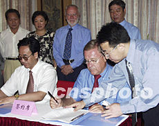 “二00三年全國鄉(xiāng)鎮(zhèn)企業(yè)東西合作經(jīng)貿(mào)洽談暨產(chǎn)品展銷會日前在中國旅游標志“銅奔馬”的故鄉(xiāng)甘肅武威閉幕。貿(mào)洽會共簽約項目七百四十五個,總投資一百六十六點七億元人民幣,引進資金一百四十三點三億元。圖為歐盟中國協(xié)會秘書長畢加和、法中協(xié)會主席稚克·溫明登先生分別與甘肅省有關部門就相互合作事宜簽約。作者:楊曉波