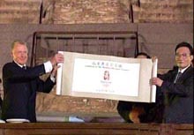 載著奧運(yùn)會(huì)會(huì)徽的車輛從中華世紀(jì)壇出發(fā),經(jīng)過長(zhǎng)安街,經(jīng)過半小時(shí)的運(yùn)送經(jīng)達(dá)天壇,由鄧亞萍和成龍護(hù)送進(jìn)入現(xiàn)場(chǎng)。