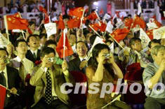2008年北京奧運會徽八月三日晚九時整在北京天壇祈年殿正式揭曉,現(xiàn)場觀眾紛紛舉起相機搶拍揭曉瞬間。中新社記者:毛建軍