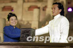 北京2008年奧運會會徽發(fā)布儀式八月三日晚在北京天壇祈年殿前廣場隆重舉行,著名影星成龍與乒乓球世界冠軍鄧亞萍護送會徽到天壇祈年殿。中新社記者:毛建軍