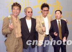 歌星許志安、蘇永康8月4日出席其《香港安康演唱會》記者會,兩人獲經(jīng)理人黃柏高(左二)及演唱會主辦機構(gòu)老板張耀榮(右一)送上鉆石咪高峰造勢助慶。中新社記者:鄧慶樂