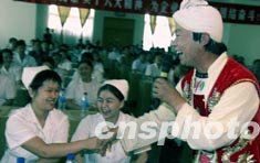 八月五日,由中國文聯(lián)組聯(lián)部、團中央辦公廳、中國民間文藝家協(xié)會等多家單位聯(lián)合主辦的健之素“全民抗非典”故事會為中鐵建總醫(yī)院的醫(yī)生們送上了一場演出,此次故事會將在北京進行約二十場義演。圖為有“陜北民歌大王”之稱的賀玉堂為醫(yī)生、護士們演唱陜北民歌。作者:盛佳鵬