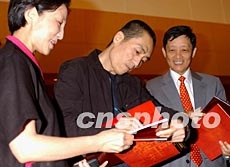 中國著名電影導演張藝謀導演的中央芭蕾舞團新版《大紅燈籠高高掛》,八月八日在北京首演成功后,忙于為京城各界人士簽名。中新社記者:賈國榮