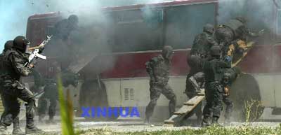 中國特戰(zhàn)隊員在依托步戰(zhàn)車進行反恐演練。在擔(dān)負“城鎮(zhèn)清剿,解救人質(zhì)”的參演部隊中,還有一支由100多名指揮官和士兵組成的反恐分隊。這支分隊從組建至今,曾多次為外軍領(lǐng)導(dǎo)做過摩托車特技、飛車抓捕、攀登、戰(zhàn)術(shù)課目等軍事表演,受到了外軍領(lǐng)導(dǎo)人的高度評價。據(jù)介紹,在正式演習(xí)之前,這支反恐特戰(zhàn)分隊的隊員們每天都定下一個目標,利用臨睡之前的半個小時進行演練。隊長薛峰每天都與戰(zhàn)士們汗流浹背地在野外山地苦練,一個動作,一招一式,絲毫也不馬虎。這支部隊的負責(zé)人曹鴻建說,反恐作戰(zhàn)不能沿用傳統(tǒng)的思維方式和戰(zhàn)法,為了應(yīng)付不同環(huán)境、不同條件下的突發(fā)事件,他們長年進行高強度、高難度的全面錘煉,目前,官兵們已全部進入臨演狀態(tài),有信心完成這次多國聯(lián)合演習(xí)中的任務(wù)。