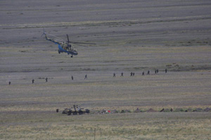 8月7日,哈薩克斯坦烏恰拉爾某空軍基地。平靜的晴空中,傳來(lái)飛機(jī)的轟鳴,兩架蘇—27戰(zhàn)斗機(jī),緊緊擠壓著一架安—26型客機(jī),向機(jī)場(chǎng)跑道滑落,驚險(xiǎn)緊張的反劫機(jī)演習(xí)正在進(jìn)行。同一天,五國(guó)部隊(duì)還進(jìn)行了“解救人質(zhì)”演習(xí)。