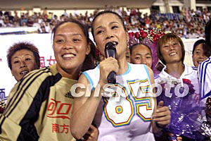 直到比賽開始后5分鐘,先農(nóng)壇體育場(chǎng)外仍有大量等著要票的球迷,這一切源于人們對(duì)女足的關(guān)愛。開球前,載著38位南北女俠的38輛摩托車緩緩駛?cè)肭驁?chǎng),在與著名歌星田震共同高歌《風(fēng)雨彩虹·鏗鏘玫瑰》這首女足之歌后,隊(duì)員們手捧著鮮花擁向前來為她們助威的“抗非典”女英雄們。女足姑娘們的精彩表演給了現(xiàn)場(chǎng)球迷至高享受,同時(shí)也為她們自己贏來了巨額的獎(jiǎng)金,獲勝的北方隊(duì)得獎(jiǎng)10萬元,而南方隊(duì)也有5萬元之多的安慰。兩隊(duì)的進(jìn)球功臣白潔、韓端因?yàn)閮?yōu)異的表現(xiàn)開走了兩輛獎(jiǎng)品摩托車。