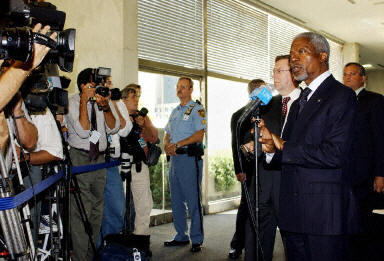 安南表示,聯(lián)合國在伊拉克的辦公大樓在星期二被炸,這對聯(lián)合國來說是可怕的一天,但聯(lián)合國不會被嚇倒。