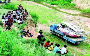 在現(xiàn)場(chǎng)看到,發(fā)生車禍地點(diǎn)是個(gè)轉(zhuǎn)彎處,道路旁有個(gè)陡坡,陡坡下是一個(gè)約10米高的懸崖。據(jù)知情者稱,這輛從吳旗到延安的客車駛到這里,與兩輛油罐車相會(huì)時(shí)突然墜入懸崖下的一條小河里,整個(gè)翻了過來。搶救者后來用鋼管等工具把客車翻過來,才將旅客救出,但已有21人當(dāng)場(chǎng)死亡,傷者立即被送往延安大學(xué)附屬醫(yī)院進(jìn)行搶救。