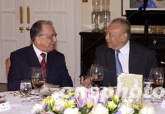 香港行政長官董建華(右)八月二十五日在禮賓府設(shè)宴招待羅馬尼亞總統(tǒng)揚(yáng)伊利埃斯庫。中新社 圖