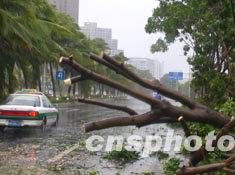 第十二號臺風(fēng)“科羅旺”八月二十五日凌晨橫掃海南?谑袇^(qū),?谑袃(nèi)大批樹木被刮倒。當(dāng)日上午許多被吹倒的樹木迅速被市政工人砍斷枝叉,以免影響交通。作者:蔣聚榮