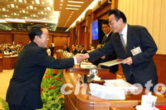 十屆全國人大常委會第四次會議今天上午在北京人民大會堂舉行,全國人大常委會副委員長李鐵映在會上主持了任命書頒發(fā)儀式。