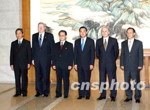 在會談開始以前,參加北京六方會談的各方代表團(tuán)團(tuán)長在釣魚臺國賓館芳菲苑大廳前集體亮相與各路媒體記者見面,他們的順序從左到右依次是日本外務(wù)省亞大局局長藪中三十二、美國助理國務(wù)卿凱利、朝鮮外務(wù)省副相金永日、中國外交部副部長王毅、俄羅斯副外長洛休科夫和韓國外交通商部次官補(bǔ)(長官助理)李秀赫。