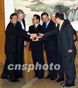 亮相之后,出現(xiàn)了一個(gè)很感染人的場面,朝鮮代表團(tuán)團(tuán)長、朝鮮外務(wù)省副相金永日的雙手與其他五國代表團(tuán)團(tuán)長的手緊緊握在一起,微笑的金永日在這些人里面尤為顯眼。這樣的場景給予了關(guān)注六方會談的人們和平解決朝核問題的期望。