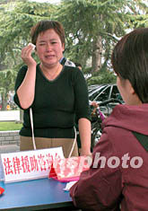 8月31日,鄭州市一位因經(jīng)濟(jì)困難而沒(méi)有委托訴訟代理人的女性在接受免費(fèi)的法律服務(wù)。當(dāng)日鄭州市許多法律援助中心走上街頭,宣傳將于9月1日實(shí)施的《法律援助條例》,并為求助的人員提供免費(fèi)的法律幫助。作者:慎重