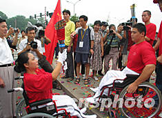 9月2日上午,第六屆中國殘疾人運(yùn)動(dòng)會(huì)火炬?zhèn)鬟f起跑儀式在南京市白馬公園舉行。圖為徐州籍運(yùn)動(dòng)員張靜從張海東手中接過火炬,開始進(jìn)行火炬?zhèn)鬟f。作者:丁東升