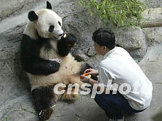 北京動物園八歲大熊貓“妞妞”8月24日生下一只幼崽后,經(jīng)過十天母子平安。與“妞妞”朝夕相處的飼養(yǎng)員成功地實行“無間隔”近距離護理產(chǎn)后大熊貓,這在北京動物園是首次。中新社記者:任晨鳴